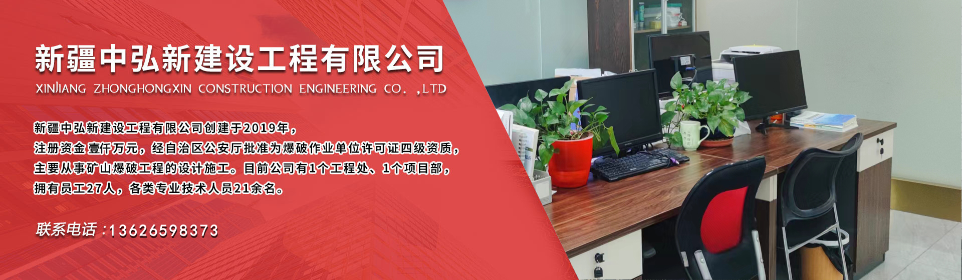 ZHONGHONGXIN CONSTRUCTION ENGINEERING 公 司 簡 介新疆中弘新建設工程有限公司創(chuàng)建于2019年,注冊資金壹仟萬元,經(jīng)自治區(qū)公安廳批準為爆破作業(yè)單位許可證四級資質(zhì),主要從事礦山爆破工程的設計施工、礦上采掘施工業(yè)務。目前公司有1個工程處、2個項目部,分...